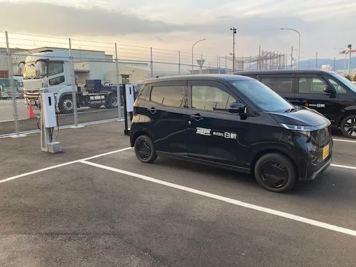 このEV充電設備は、当営業所における業務車両の電気自動車への入れ替え促進に伴い設置したもので、今後普及が見込まれる6.0kw充電車にも対応しており、より短時間で充電も可能です。電気自動車は、コンテナヤード内の往復等短距離間の移動に適しており、今後更に追加導入を予定しております。