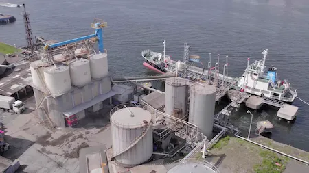 川崎地区に液体・粉体を取り扱うタンク(7基)・サイロ(6基)、専用桟橋、ドラム充填を保有しています。